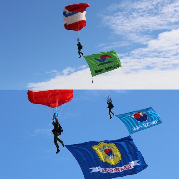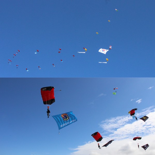 이어진 애국가 제창 중 특수전부대 요원들은 대한민국 UN가입 30주년을 기념해 태극기와 해외 파병부대 깃발을 펼치며 고공 낙하하는 모습을 보였다.