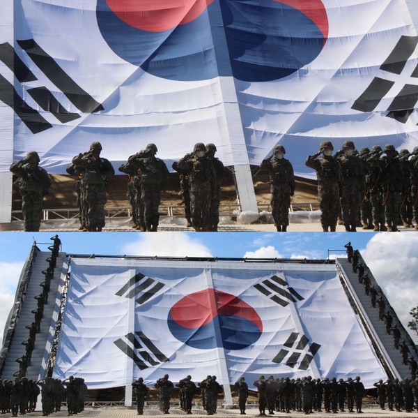 국기에 대한 경례 중 3000t급 잠수함 도산 안창호함이 태극기를 게양하고 마라도함 앞을 지나갔다. 경례 맹세문은 6·25전쟁 당시 통영상륙작전과 인천상륙작전, 서울수복작전에 참전한 해병 1기 이봉식 옹이 낭독했다.
