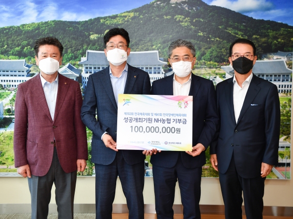 NH농협은행 경북본부는 전국체전의 성공적인 개최 기원을 위해 최근 경북체육회에 성금 1억원을 전달했다. 성금 전달식에는 강성조 행정부지사를 비롯해 금동명 농협 경북본부장, 김하영 경북체육회장 등이 참석했다.