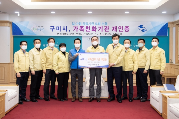 장세용 구미시장은 ‘ 가족친화직장 분위기 조성과 직원의 일∙가정 양립을 위해 가족친화정책을 확대하고, 가족친화인증제도를 관내 기업 및 기관에 지속적으로 홍보하고 자발적인 인증취득을 유도해 가족친화도시 구미의 이미지 제고를 위해 최선을 다하겠다’고 전했다.