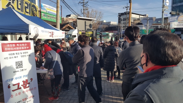 추운 날씨에 참석한 약 600여 명의 시민들은 이 자리에서 ‘대장동 몸통 그분은 반드시 구속 수사하라’, ‘대장동게이트 특검을 즉각 시작하라’, ‘특검이 시작되고 대장동 몸통이 구속될 때까지 서명운동을 전개하자’ 라는 구호를 외쳤다.