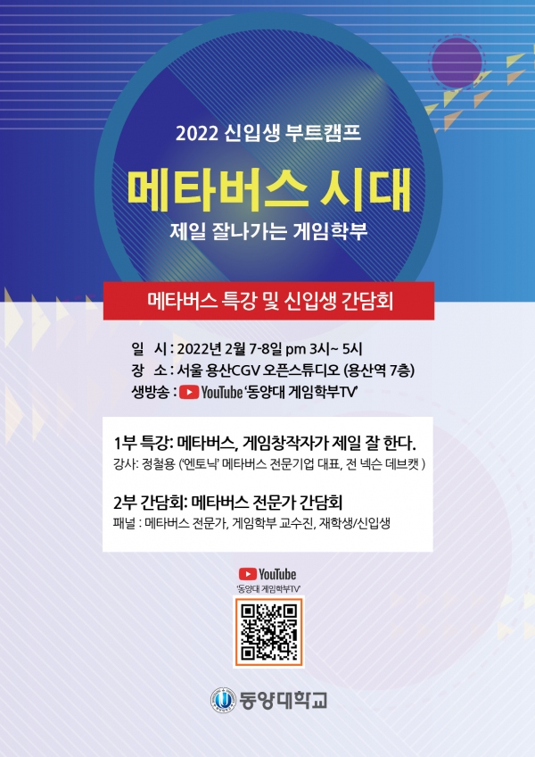 양일간 특강에 이어 ‘메타버스 전문가 간담회’도 진행한다. 간담회 시간에는 메타버스 전문가와 함께 게임학부 교수진 그리고 신입생과 학부모가 함께 ‘메타버스’에 대한 궁금증과 게임학부 진로 등 소통의 시간을 가질 예정이다.