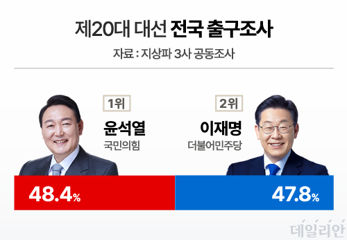 KBS·MBC·SBS 등 방송 3사의 제20대 대선 출구조사에서 이 후보가 47.8%, 윤 후보가 48.4%로, 윤 후보가 0.6% 차이로 1위를 차지한 것으로 나타났다.