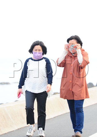 16일 포항시 전역이 미세먼지로 뒤덮힌 가운데 북구 환호해맞이 공원 해안 산책로에 마스크를 쓴 시민들이 걸어가고 있다. 이날 환경부는 포항제철소 등 공단 밀집 지역인 남구 장흥동에 231㎍/㎥의 미세먼지가 검출됐다며 주의보를 발령했다.