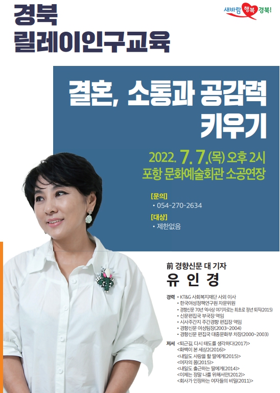 특히 MBN ‘속풀이쇼 동치미’, ‘알토란’, KBS ‘아침마당’ 등으로 대중들에게 잘 알려진 기자 출신 방송인 유인경 씨를 강사로 초청해 ‘결혼, 소통과 공감력 키우기’라는 주제로 강의를 진행한다.