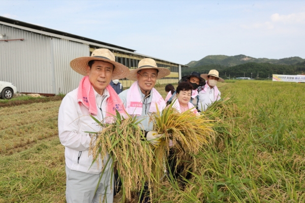 이날 첫 벼베기 행사에는 이강덕 포항시장과 쌀 전업농, 농업 관련단체 및 농협관계자 등 200여 명이 참석한 가운데 벼 수확현장을 방문해 농업인들과 같이 수확의 기쁨을 나누고, 올해 폭염으로 고생한 농업인들의 노고를 격려했다.
