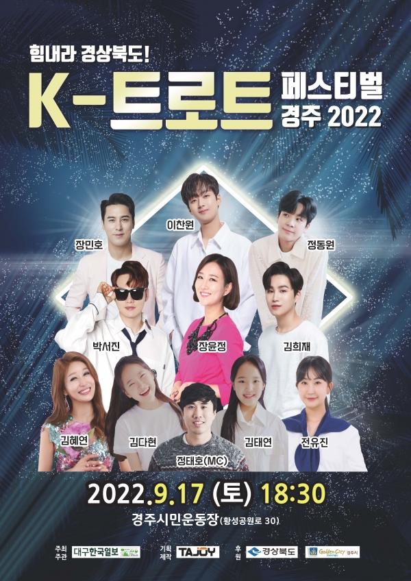 전석 무료이며 경주시와 경북도가 후원하고 ㈜대구한국일보가 주관한다. 코로나19로 지친 시민들의 일상을 위로하고 잠시나마 힐링의 시간을 선사키 위해 마련됐다. 이번 공연은 인기 트로트 오디션 TV프로그램인 ‘미스&미스터 트롯’ 방영으로 탄생한 차세대 트로트 스타들을 비롯해 ‘트로트의 여왕’으로 불리는 장윤정과 김혜연의 출연도 단연 돋보인다.