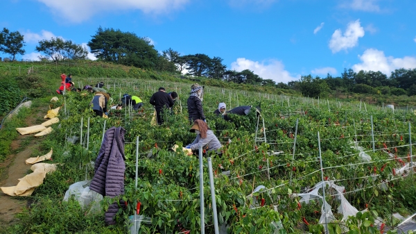 이날 농촌 일손돕기는 석보면사무소, 기획예산실, 문화관광과, 경제일자리과, 지역개발과 등 5개 부서의 공직자 30명이 참여해 석보면 포산리에 위치한 6000㎡ 고추밭의 고추수확 작업에 구슬땀을 흘렸다.