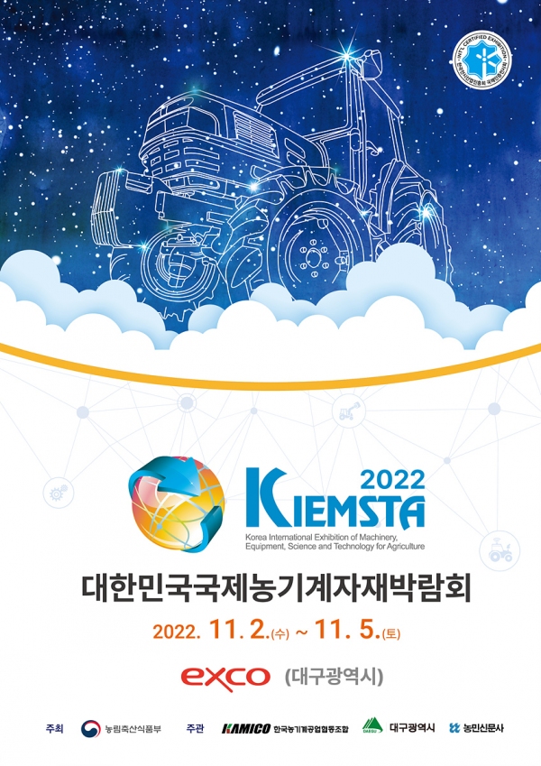 국내·외 농기계자재 분야별 최신 기술과 트렌드를 한눈에 볼 수 있는 대규모 국제 농기계 전문 전시회인 ‘2022 대한민국 국제 농기계자재 박람회(KIEMSTA 2022)’가 2일부터 5일까지 4일간 엑스코에서 열린다.