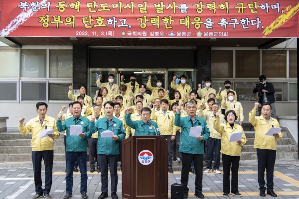 울릉군은 지난 3일 군청 광장에서 김병욱 국회의원(포항남·울릉), 공경식 울릉군의회 의장 및 군의원, 남진복 경북도의원, 군청 공무원 등이 참석한 가운데, 공동 명의로 성명서를 발표해 북한의 탄도미사일 발사를 규탄하고 1만여 울릉군민의 생명과 영토 안보를 지키는데 정부차원의 강력한 대응을 촉구했다.