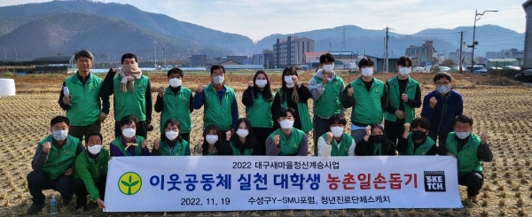 이 행사는 2022 대구새마을정신계승사업의 일환으로 대학생들에게 근면․자조․협동의 새마을정신을 체험하게 하고 농촌봉사활동을 통해 도시와 농촌이 더불어 살아가는 사회를 만드는데 기여하고자 기획됐다.