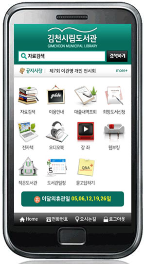 김천시립도서관이 스마트시대를 살아가고 있는 시민의 라이프스타일에 부응하기 위하여 모바일앱의 개발을 완료하고 지난 5월부터 서비스를 실시하여 이용자의 호평을 받고 있다.