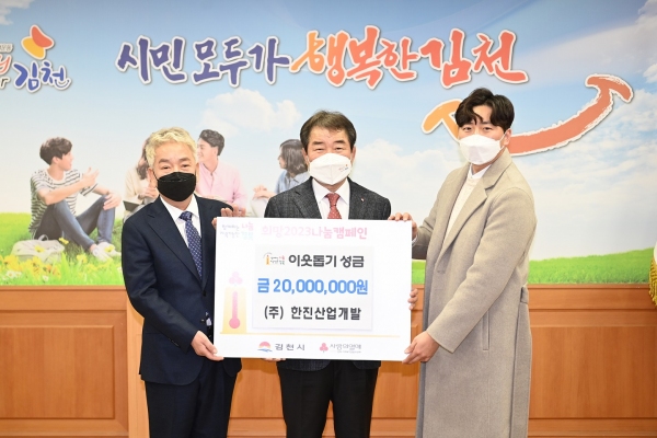 김충섭 김천시장은 “지역발전을 위해 나눔과 상생의 가치를 실현하는 김욱석 대표님 이하 한진산업개발 직원들에게 감사드린다”며 “한진산업개발의 소중한 뜻과 후원금을 잘 전달하여 더불어 살아가는 행복김천을 만들어 나가겠다”고 밝혔다.