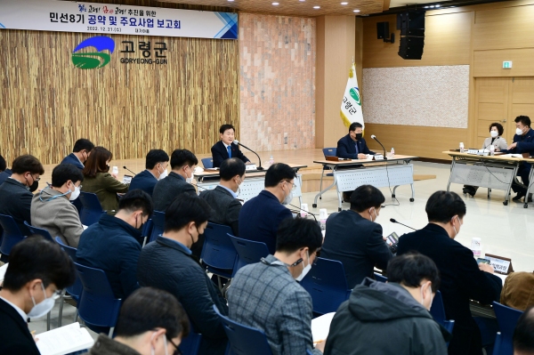 이날 보고회는 민선 8기 56개 공약에 대한 구체적인 실행방안과 추진계획 등에 대해 부서별로 보고하는 자리를 가졌다. 특히 이번 보고회는 고령군의회에서도 참석하여, 민선 8기 공약사업의 추진상황을 의회와 소통 공유하여 더욱 더 내실 있는 사업의 추진을 기대하게 했다.