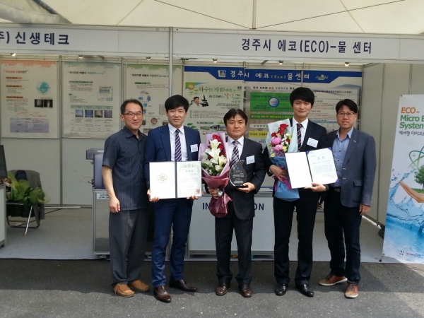 ▲2014년 환경의 날을 기념해 마련된 심포지엄에서 경주시가 전국물관리 효율화 우수 지자체에 선정됐다. 사진은 이번 수상의 주인공들인 경주시 에코-물센터 정임락 소장(가운데)과 직원들. |