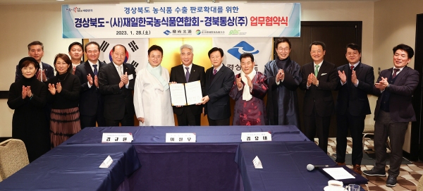 이어 도-재일한국농식품연합회-경북통상 간에는 경상북도 농식품 수출판로 확대를 위한 업무협약을 체결하고, 경북 우수 농식품의 일본진출 활성화와 재일한국농식품연합회 일본 내 사업의 적극 지원을 약속했다.