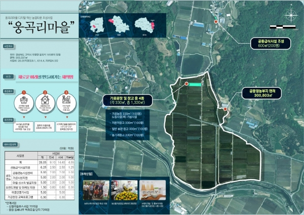 무을면 웅곡리 일원(약30ha)에 내년부터 2024년까지 총사업비 28억 원을 투입해 공동급식시설, 분질미 및 특수미 등을 처리할 수 있는 도정시설 및 식량작물 기반조성에 필요한 시설·장비 지원과 6차 산업화 지원으로 농가의 새로운 부가가치 창출과 일자리 제공으로 청년농업인 인구유입을 유도하고 농가소득 증대에 크게 기여할 것으로 기대한다.