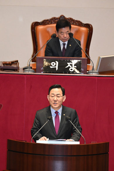 주 원내대표는 이날 오전 국회에서 교섭단체 대표연설에서 "민주당은 자제와 관용은커녕 왜곡과 견강부회로 법치주의를 형해화하는 폭거를 반복하고 있다"며 "특히 검수완박(검찰 수사권 완전박탈)법 처리를 위해 양향자 의원을 내치고 민형배 의원을 위장 탈당시킨 후 법제사법위로 보낸 사건은 권모술수밖에 남지 않은 민주당의 민낯을 남김없이 드러냈다"고 비판했다.