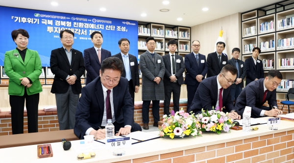 경북도는 14일 도청 미래창고에서 경주에 본사를 둔 국내 최대 에너지 공기업 한국수력원자력(이하 한수원) 및 한국에너지공단과 함께‘기후위기 극복 경북형 친환경에너지 산업단지 조성’투자협약을 체결했다.