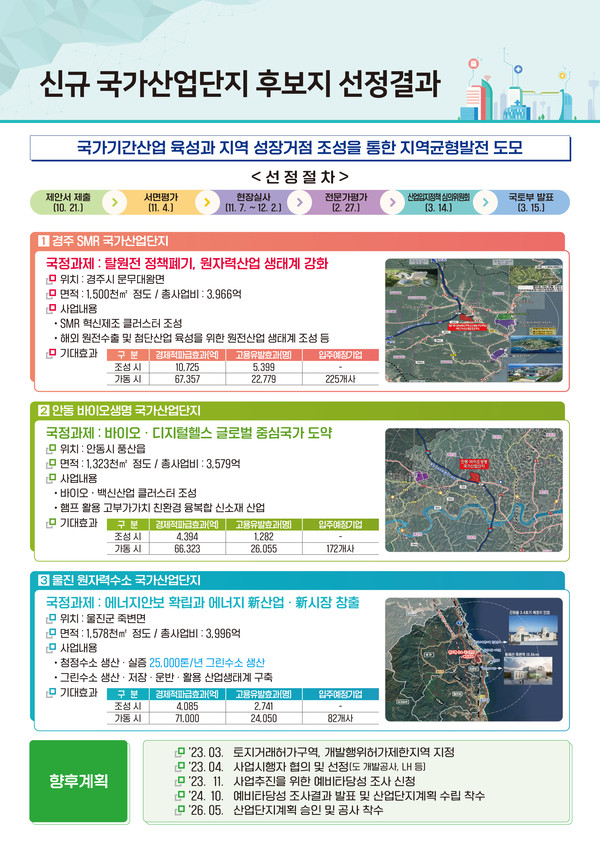 경북도는 15일 국토교통부에서 발표한 신규 국가산업단지 후보지로 경주SMR 국가산업단지, 안동바이오생명 국가산업단지, 울진원자력수소 국가산업단지 후보지 3곳 모두 선정되었다고 밝혔다.