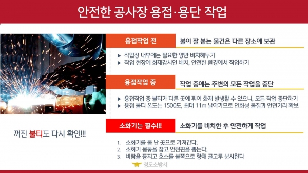 조유현 청도소방서장은 “용접·용단 작업 시 발생한 불티는 대형화재를 초래할 수 있다”며 “관계인의 공사장 안전관리와 경각심 고취를 위해 지속적인 홍보를 실시하겠다”고 전했다.