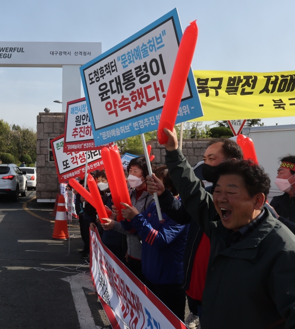 대구 북구 주민들이 대구시가 문화예술허브 조성 사업 부지를 북구에 있는 경북도청 후적지(현 대구시청 산격청사)에서 달성군 쪽으로 변경 추진하자 거세게 반발하고 나섰다.