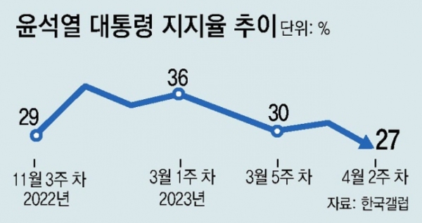 한국갤럽이 11일부터 3일간 전국 성인 1002명을 대상으로 실시한 여론조사 결과, 윤 대통령이 직무 수행을 '잘하고 있다'는 응답은 27%, '잘못하고 있다'는 응답은 65%로 집계됐다. 이는 지난해 11월 셋째 주 이후 30%대를 유지했던 긍정평가가 5개월 만에 20%대로 하락했다. 윤 대통령의 취임 이후 가장 낮은 긍정평가는 비속어 논란이 불거졌던 지난해 9월로 24%를 기록한 바 있다.