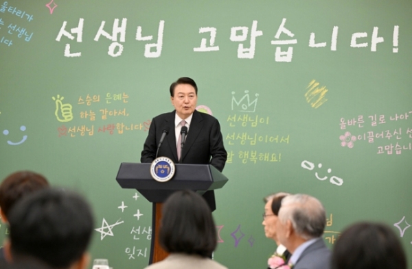 윤 대통령은 "정말 아무것도 모르던 코흘리개 초등학교 1학년부터 학교를 졸업할 때까지 선생님의 무한한 사랑과 은혜를 입어서 성장을 하고 저 역시도 계속 공직을 맡게 된 게 아닌가 생각이 든다"라며 "제일 중요한 것은 교육 현장인 학교에서 선생님의 사랑이고, 또 사랑을 받는 학생들은 감사할 줄 알아야 된다 하는 것"이라고 말했다.