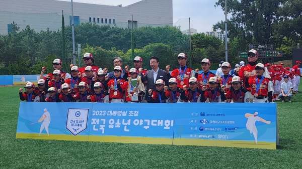 | ▲ 지난 1일부터 2주간 서울 용산구 용산어린이정원에서 펼쳐진 2023 대통령실초청 전국유소년야구대회에서 3위를 차지한 포항대해초등학교 선수들이 기념촬영을 하고 있다. 포항대해초등학교 제공 | ||