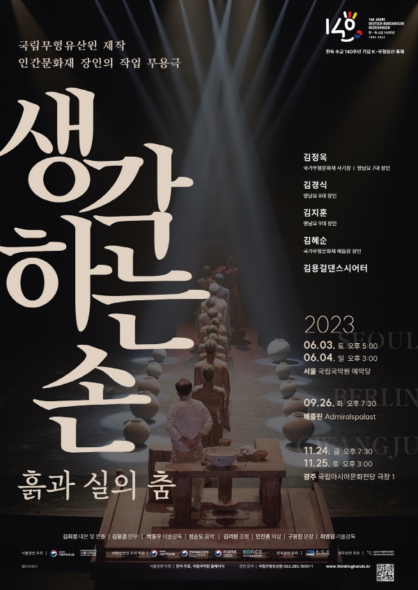 '생각하는 손'은 2021년 11월 국립무형유산원이 제작하고 초연해 평단의 호평을 받은 공연으로 국가무형문화재 ‘김정옥 사기장’과 ‘김혜순 매듭장’의 실제 작업을 공연화한 최초의 작품이다. 미국의 사회학자 리처드 세넷의 저서 「장인(The Craftsman)」에서 영감을 받았으며, ‘최고의 경지를 향해 정진하는 사람’을 뜻하는 ‘장인’을 중심에 두고 ‘흙’과 ‘실’이 우리 전통 공예인 ‘도자기’와 ‘매듭’으로 완성되는 인고의 과정을 총 2막의 무용극으로 구성했다.