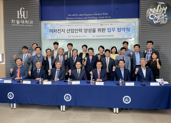 포항시는 7일 한동대학교 올네이션스홀에서 권혁원 포항시 일자리경제국장, 최도성 한동대 총장, 곽진환 선린대 총장, 이성열 제철공고 교장, 배영호 포항테크노파크 원장, 송경창 경상북도 경제진흥원장, 김종수 한국생산성본부 경북동부센터장 등 30여 명이 참석한 가운데 이차전지 산업인력 양성을 위한 업무협약을 체결했다고 밝혔다.