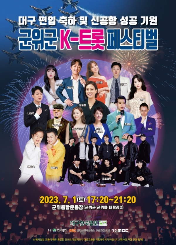 군위군의 대구편입을 축하하고 대구·경북의 100년 미래를 책임질 신공항 성공을 기원하기 위해 열린 이번 행사는 주민들을 더욱 흥겹게 할 트롯 페스티벌을 함께 열었다.