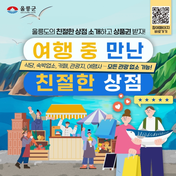 울릉군을 방문한 관광객이라면 누구든지 참여할 수 있으며 친절한 서비스와 좋은 상품이 돋보이는 음식점, 카페, 숙박업소, 여행사, 관광지, 쇼핑상점 등을 대상으로 울릉군 관광문화 누리집에 친절상점 소개글을 작성하면 매월 추첨을 통해 선정된 2명에게 울릉사랑상품권을 지급한다.