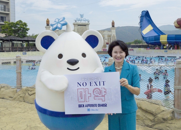 윤재연 블루원리조트 대표는 지난 9일 경주 블루원 워터파크에서 진행된 마약근절 SNS 홍보를 위한 사진 촬영에서 ‘출구 없는 미로 NO EXIT, 마약 절대 시작하지 마세요’ 라는 문구가 적힌 패널을 들었다. 현장에 있던 블루원 직원들도 마약 근절 캠페인에 동참코자 응원 문구가 적힌 현수막을 펼쳐들었다.
