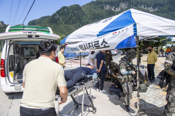 또한 나리분지에 드론 등을 이용한 테러가 발생해 건물 일부 파손, 화재 발생, 화생방 작용제 유출에 따른 사상자가 발생한 상황을 가정해 통합상황실 운영 테러범 및 화재 진압 임시진료소 설치 응급구조 순으로 진행 했다.