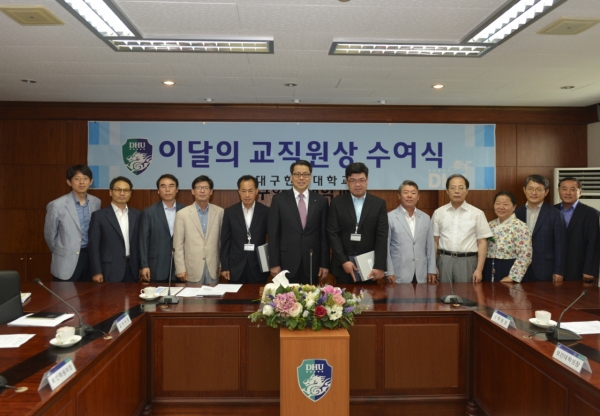 대구한의대(총장 변창훈)는 창의적이고 적극적인 자세로 직무를 수행하는 직원을 선발해 포상함으로써 직원들의 사기 진작과 동기 부여를 주기위해 ‘이달의 최고 교직원상’을 제정, 지난 16일 첫 시상식을 가졌다.이날 6월의 최고 교직원상 수상자는 황춘목 시설관리팀장, 이창희 시설관리팀 직원이 선정됐다.황춘목 시설관리팀장은 다년간 실무 경험을 토대로 원만한 민원해결 노력과 대학 예산 절감에 기여했으며, 이창희 시설관리팀 직원은 민원처리에 대한 자료 조사 등 다양한 업무를 성실하고 적극적인 자세로 수행하고 오성캠퍼스 민원의 원만한 처리에 기여한 공로를 각각 인정받았다.이날 변창훈 대구한의대 총장은 “자기 직무에 대한 자부심과 긍지를 갖고 실천하는 직원들에게 수상의 기회가 주어져 기쁘다”며 “대학 직원들도 행정의 합리성과 전문성을 위해 연구하고 개선하려는 노력이 필요하며, 대학 경쟁력 제고를 위해 열정을 다하는 직원에게는 모든 지원을 아낌없이 하겠다”고 말했다.