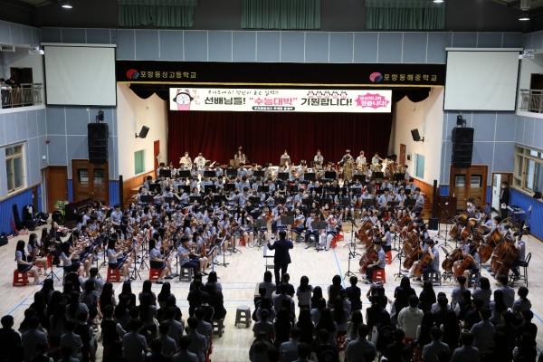 지난달 26일에는 수능을 50여일을 앞두고 고3 수험생들을 위한 재학생들의 수능 고득점기원 음악회를 시작으로 새로운 각오와 다짐을 하는 시간을 가지기도 했으며 선배들을 응원하기 위해 1, 2학년 재학생 170여명으로 구성된 오케스트라단은 사물놀이 연주에 이어 포항동성고를 위해 편곡된 동성 판타지아를 연주했고 이어 포항시립합창단의 공연과 재학생 트롯가수 전유진양(포항동성고 2학년)의 응원가가 교정을 울리며, 3학년 선배들의 수능 대박을 기원했다.
