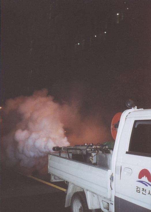 이를 위해 지난5월말부터 10월까지 도심내 도로변, 골목길, 하천, 농촌지역에 대해서는 23개반 47명의 방역기동반을 편성하여 매일 분무 야간 연막소독을 실시하고 음식물 및 쓰레기 집하장, 물웅덩이 등 취약지역도 매주 1회이상 잔류 분무소독을 실시하고 있다.