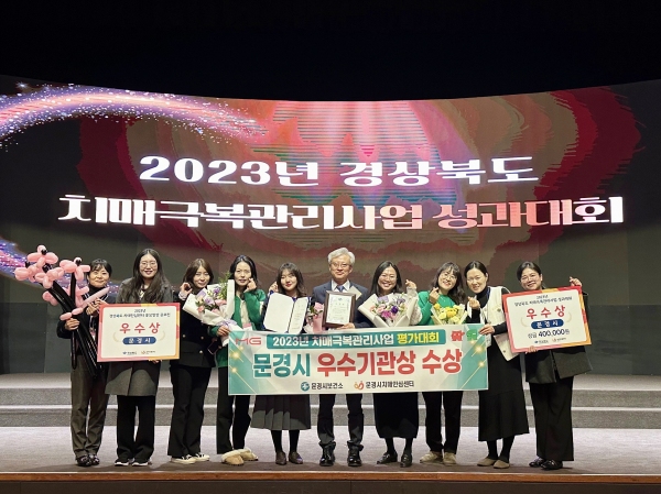 ▲지난 29일 대구 인터불고 엑스코 호텔에서 개최된 ‘2023년 치매극복관리사업 평가’에서 우수기관상을 수상한 문경시보건소 직원들이 기념촬영을 하고 있다. 문경시 제공 문경시가 경북도가 주관으로 지난 29일 대구 인터불고 엑스코 호텔에서 개최된 ‘2023년 치매극복관리사업 평가’에서 우수기관상을 수상했다. 박애주 문경시보건소장은 “치매는 환자와 가족뿐만 아니라 지역주민 모두가 관심을 가지고 함께 극복해 나가야 할 문제”라며 “치매가 있어도 살기 좋은 도시를 실현하기 위해 최선을 다하겠다”고 말했다.