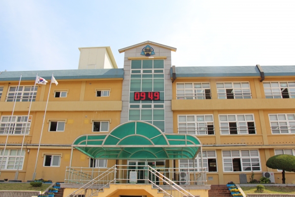 <사진설명>청송초등학교 제58회 동기회가 기증한 LED전광판 시계가 부착된 학교전경.