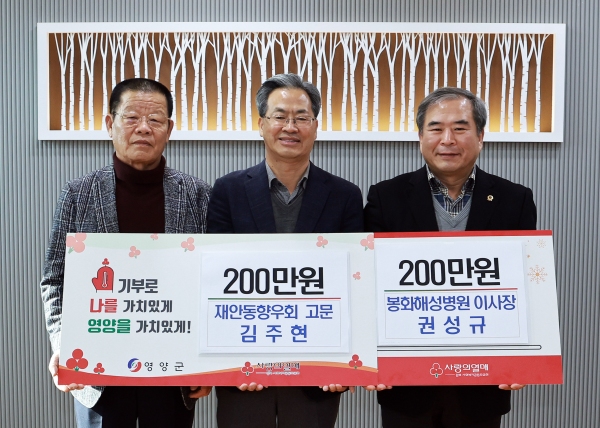 ▲ 영양군 제공. 봉화해성병원 이사장 권성규(전 재안동향우회장)씨와 재안동향우회 고문 김주현씨는 19일 영양군에 ‘희망2024나눔캠페인’성금 400만원을 전달했다. 권성규 이사장과 김주현 고문은 수년째 영양군에 기부를 이어오고 있으며, 꾸준한 사회봉사와 기부활동으로 아낌없는 고향 사랑을 전하며 영양군의 발전을 위해 헌신하고 있다.