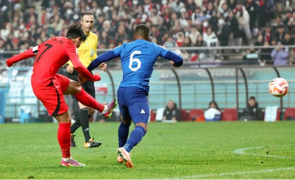 손흥민은 지난 11월 16일 서울월드컵경기장에서 열린 북중미 월드컵 아시아 2차 예선 싱가포르와의 경기에서 후반 18분 반대쪽 골그물 상단에 꽂히는 왼발 중거리 슛으로 이날 대표팀의 세 번째 골을 터뜨렸다.