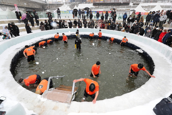 산천어 맨손 잡기에 나선 방문객들은 추위에도 아랑곳하지 않고 반소매에 반바지만 입은 채 물속에 뛰어들어 맨손으로 물고기를 쫓으며 추위를 잊었다.