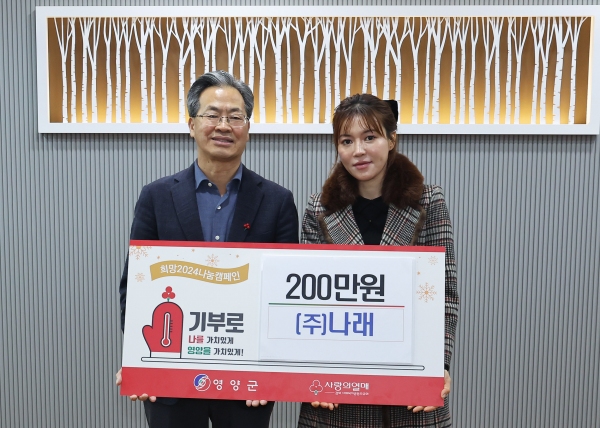▲ 영양군 제공 (주)나래는 17일 영양군에 ‘희망2024나눔캠페인’ 성금 200만원을 전달했다. (주)나래는 CCTV, 스피커 전문시공업체로 해마다 이웃사랑 실천에 앞장서며 꾸준한 사회 환원 활동으로 나눔문화 확산에 기여하고 있다. 김민서 대표는“지역에서 사업을 하며 조금이나마 베풀고 나누는 삶을 살고 싶다”라며, “작은 정성이지만 어려운 이웃들에게 도움이 됐으면 좋겠다”라고 소감을 밝혔