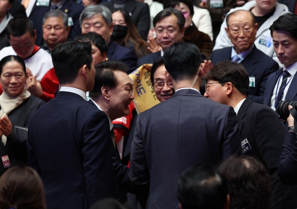 이에 대통령실 관계자는 기자들과 만나 "대통령이 입장한 참석자들과 일일이 악수를 가운데 강 의원이 대통령의 손을 놓지 않고 소리를 질렀다"며 강 의원이 윤 대통령의 손을 본인 쪽으로 당기기도 했다고 설명했다.