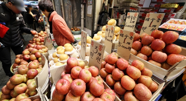 사과와 배 가격은 지난해 설 연휴 전 각각 4만420원, 4만580원과 비교해도 두 배 수준으로 껑충 올랐다.