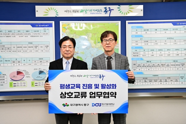 특히, 이번 협약체결로 동구 구민 또는 동구청 소속 공무원이 대구 가톨릭대학교 유스티노자유대학 입학 시 산학협력 장학 혜택을 받을 수 있게됐다.