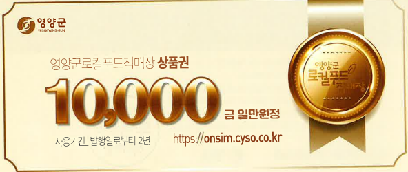‘로컬푸드직매장 상품권’은 10만원 당 5천원 할인된 금액으로 구매한도 없이 구입할 수 있어 청정 영양의 신선한 농산물 뿐만 아니라 전국 최고 빛깔찬 고춧가루, 영양 은하수 막걸리, 상화병 등 지역의 이야기가 녹아있는 농특산품도 5% 할인된 가격에 구입할 수 있다.