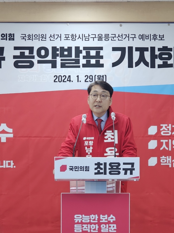 최 후보는 29일 포항시청에서 ‘변화와 혁신, 담대한 도전, 글로벌 포항’을 주제로 11대 핵심공약 발표를 했다.