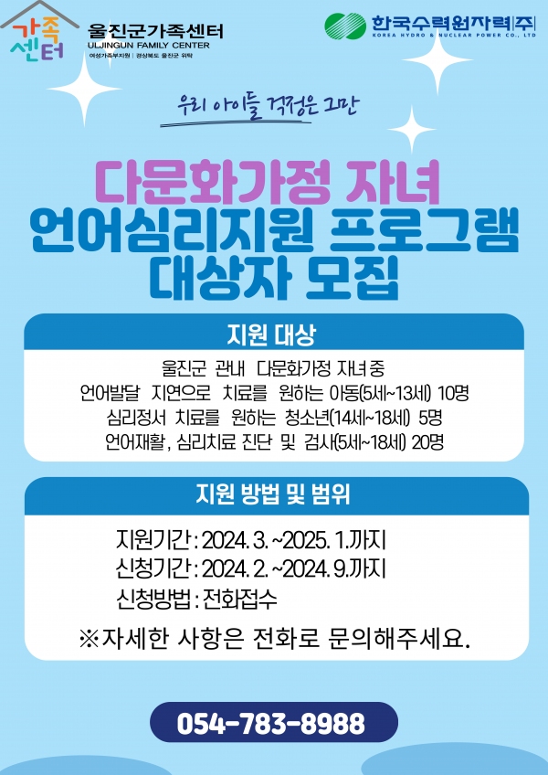 이 사업은 2024년 한수원사업자지원사업 '다문화가정 자녀 학습 프로그램'의 일환으로 관내 다문화가정 자녀 중 다양한 원인으로 의사소통에 어려움을 겪고 있는 5세~13세 아동을 위한 언어재활치료와 청소년들을 위한 심리치료를 목적으로 하고 있다.